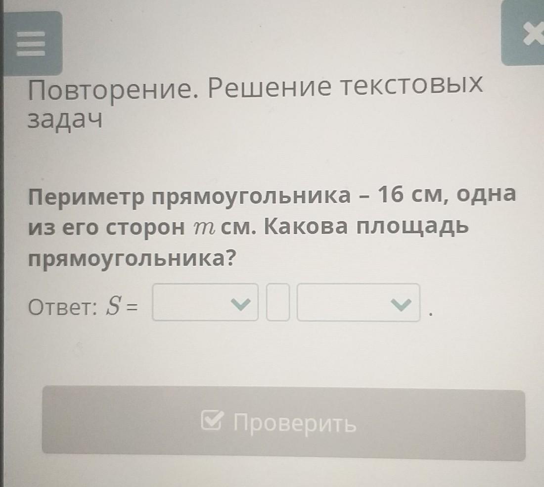 Периметр прямоугольника - 16 см, одна из его сторон т см. Какова площадь прямоугольника?