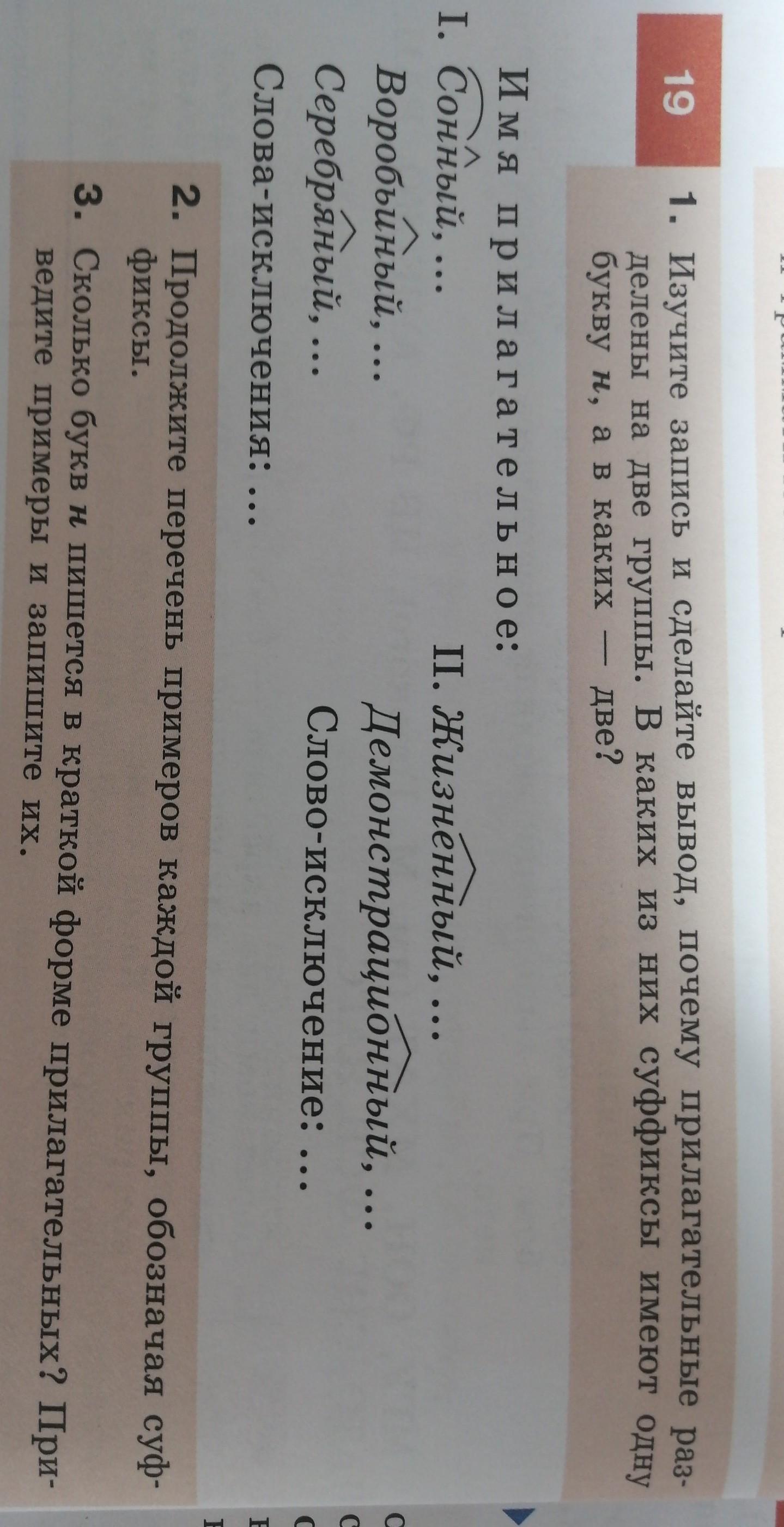 Изучите запись и сделайте вывод Почему прилагательные разделены на две группы В каких из них суффиксы имеют одну букву Н А в каких две