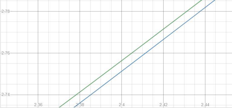 Так и есть, они будут сходится, но не пересекутся. Правильный синий график выглядит аналогично, только выгнут в другую сторону
