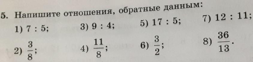 5. Напишите отношения, обратные данным: 1) 7: 5; 3) 9: 4; 5) 17:5; 7) 12:11; 3 3 2) 2) 4) 11 5 8 6) 36 8) 13