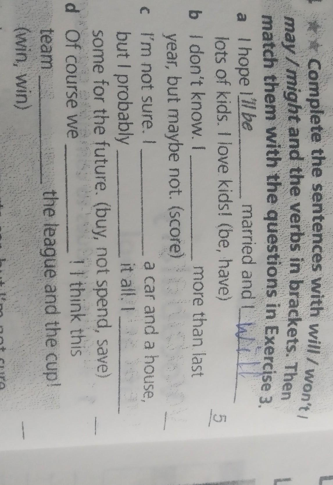 complete the sentencen wint will/won't and the verbs in brackents . Then math them with questions in Exercise 3 i don't .