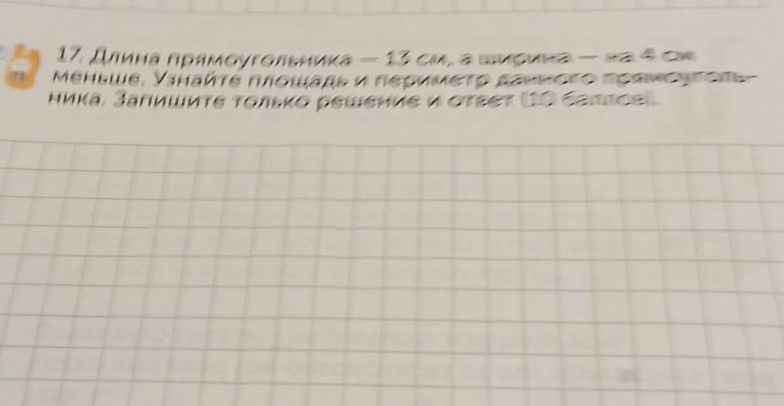 e 17. Длина прямоугольника — 13 см, а ширина на 4 см меньше. Узнайте площадь и периметр данного прямоуголь- ника. Запишите только решение и ответ (10 баллов).