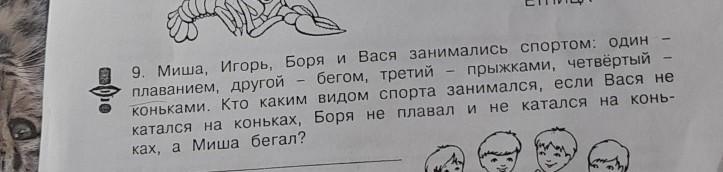 - 9. Миша, Игорь, Боря и Вася занимались спортом: один плаванием, другой бегом, третий прыжками, четвёртый Коньками. Кто каким видом спорта занимался, если Вася не катался на коньках, Боря не плавал и не катался на конь- ках, а Миша бегал?