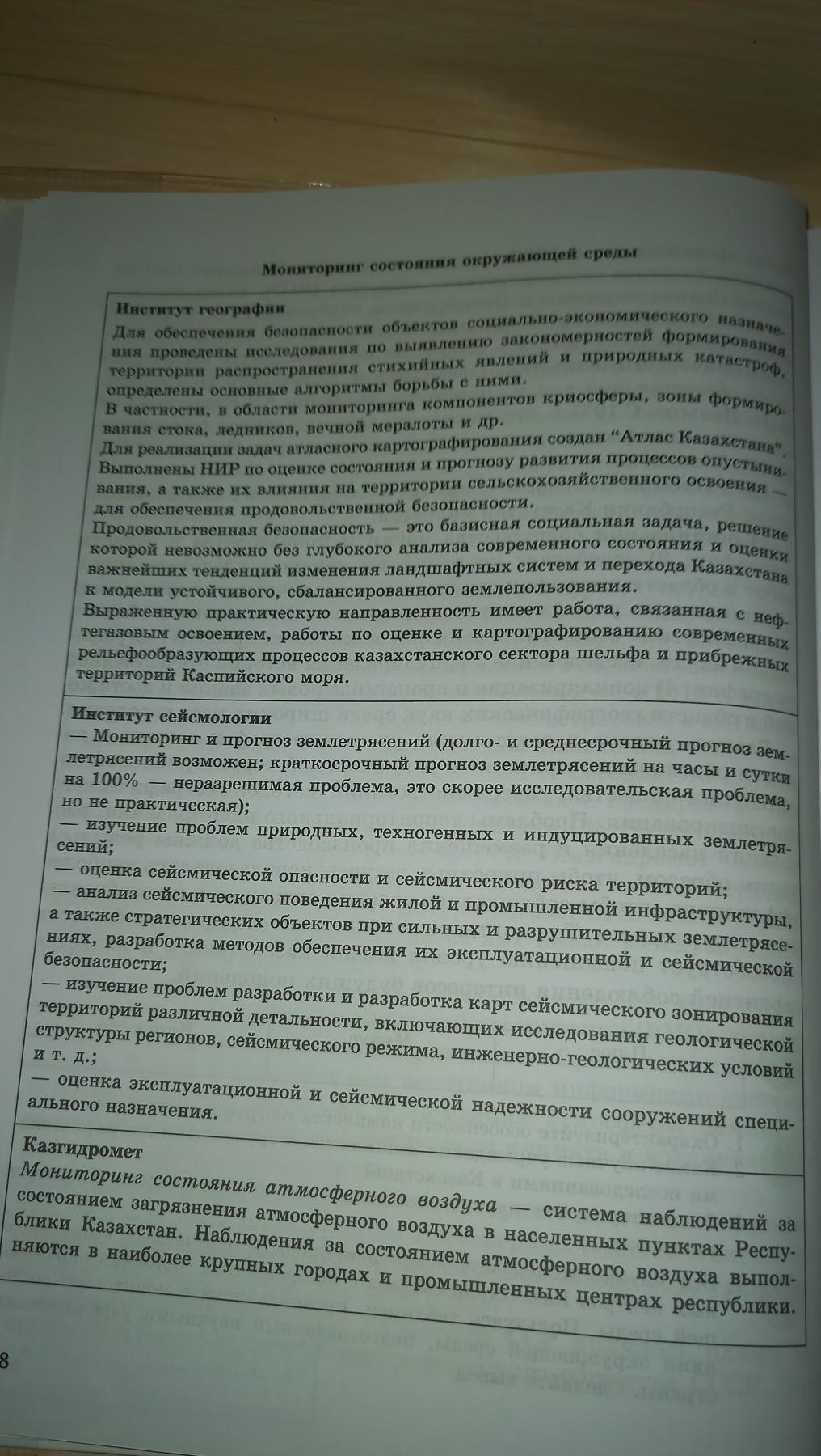 1. Вся научно-исследовательская деятельность отмеченных выше науч- ных центров Казахстана связана с мониторингом состояния окружаю- щей среды. Пользуясь таблицей, проанализируйте мониторинг состо- яния окружающей среды, подготовленный научными учреждениями Мусабаев страны. Сделайте вывод.
