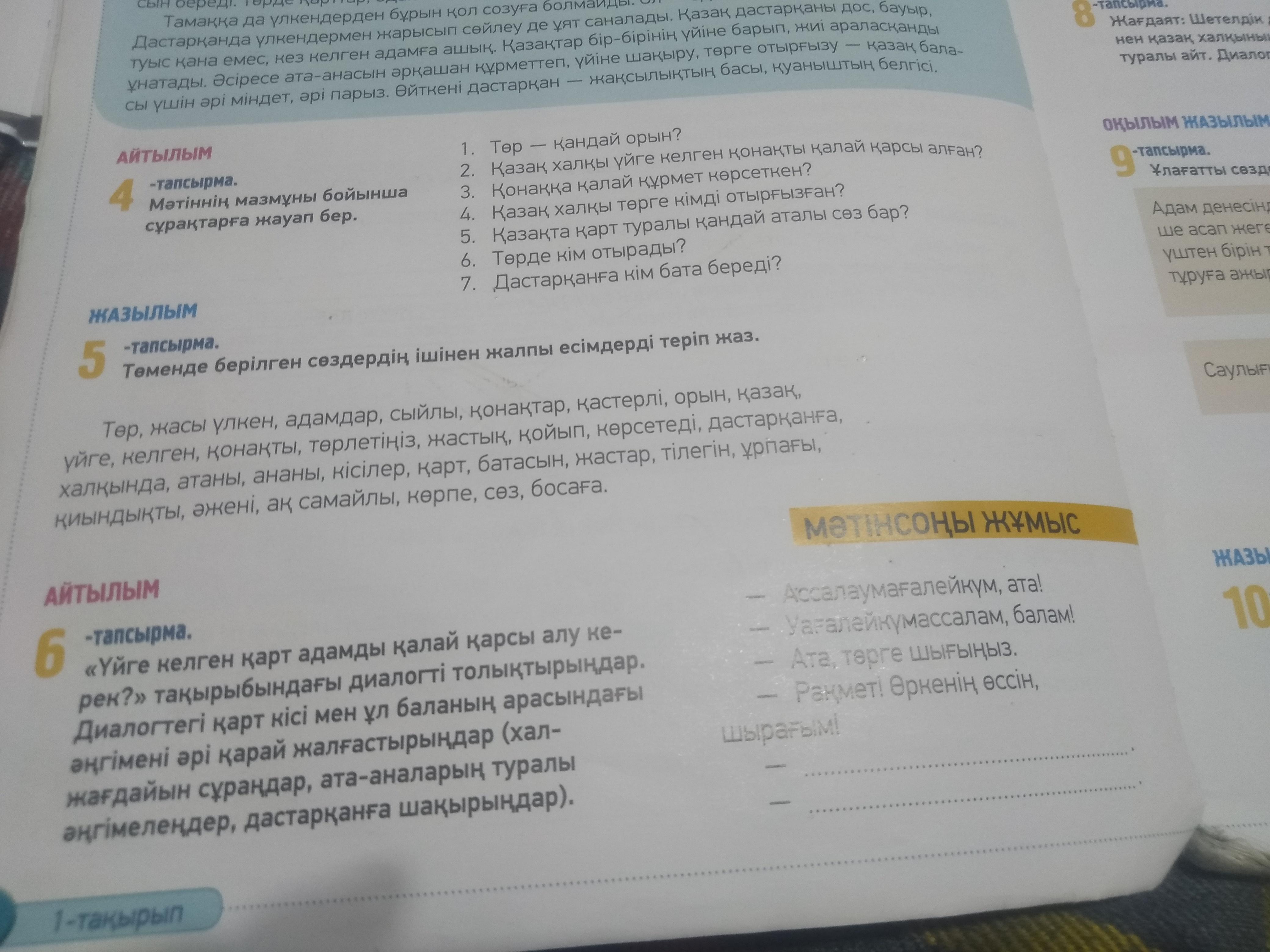 Помогите срочно казаский 5класс Составить диалог 4,5,6,7задание после седьмого добавить три своих предложений