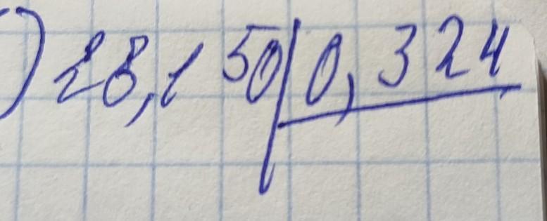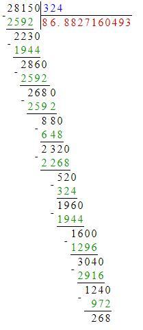Для удобства вычислений преобразуем делимое и делитель в целые числа. Для этого умножим делимое 28.15 и делитель 0.324 на 1000. В результате наша задача сведется к делению следующих чисел.