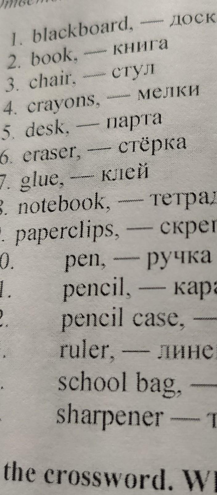 blackboard-блэкбоард, book-бук, chair-чеир, crayons-крайонс, desk-дэск, eraser-эрасэр, glue-глу, notebook-нотбук, paperclip-папэр клип, pen - пэн, pencil-пэнсил, pencil case-пэнсил кэйс, ruler-рулэр, school bag-скул бэг,