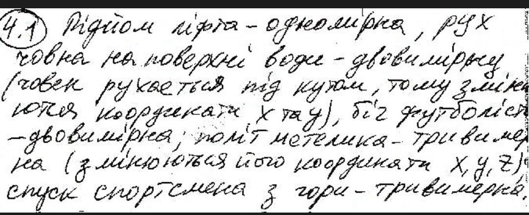 якою системою координат (одновимірною двовимірною чи тривимірною) ви оберете описують такі рухи; підйом ліфта; рух човна; по поверхні води; біг футболіста на полі ; політ метелика ; спуск спортсменки з гори на лижах