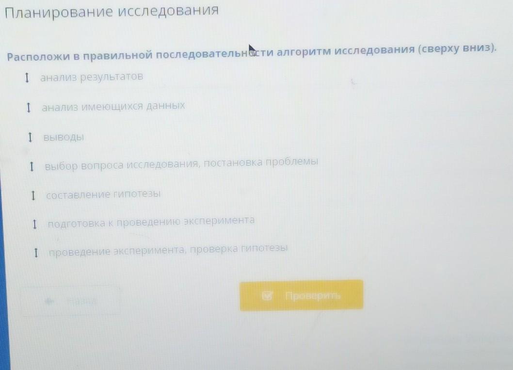 сначала выбираем вопрос для исследования, затем ставим гипотезу, анализируем данные подготовка к эксперименту, потом сам эксперимент, анализ результата и вывод
