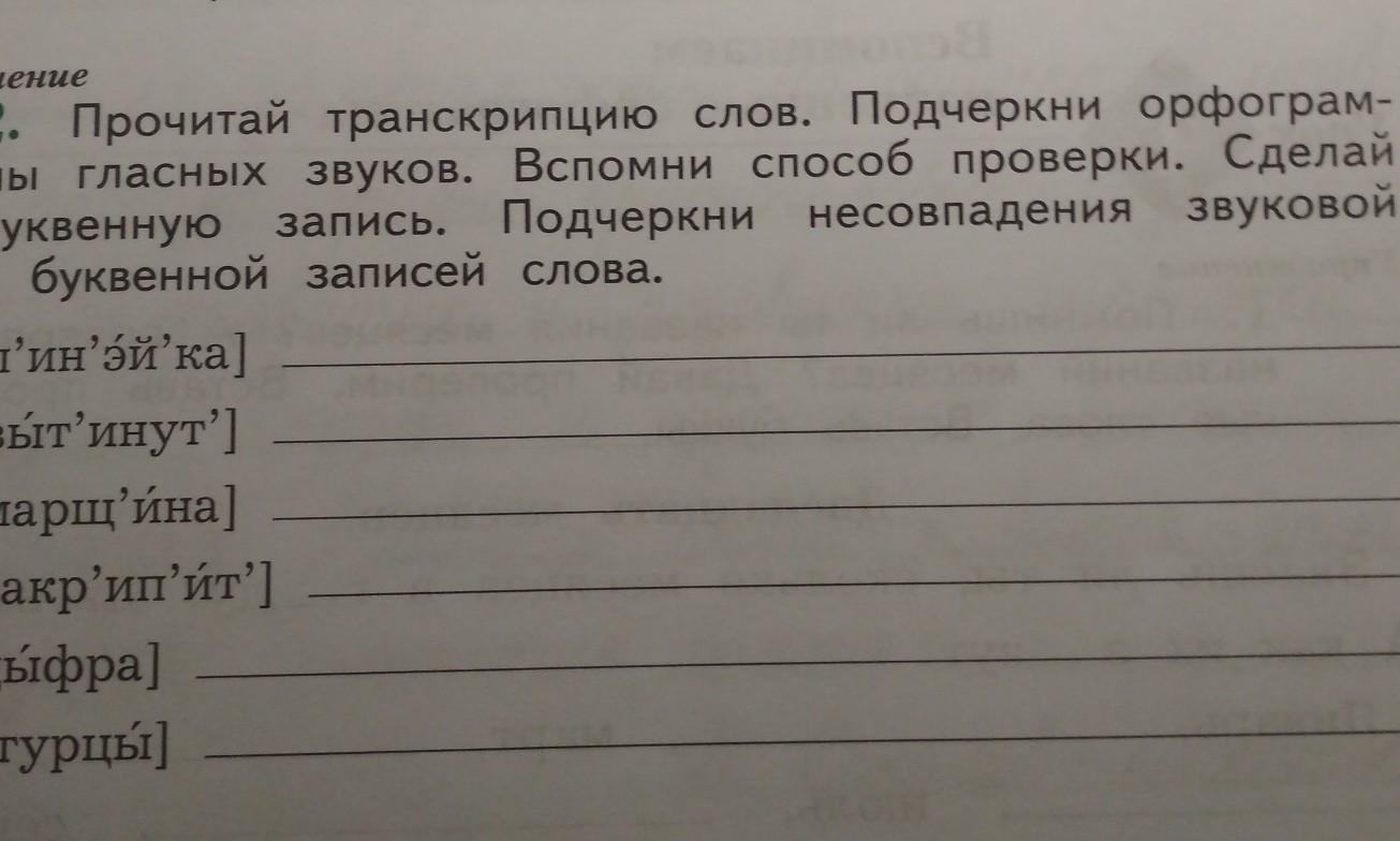 Прочитай транскрипцию слов. Подчеркни орфограммы гласных звуков. Вспомни способ проверки. Сделай буквенную запись. Подчеркни несовпадения звуковой и буквенной записей слова.