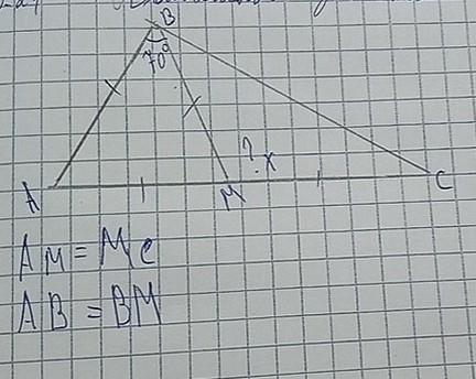 Ну треугольник AMB равносторонний и получается так что все углы равны, поэтому угол AMB РАВЕН 70 ИЗ 180 вычти 70