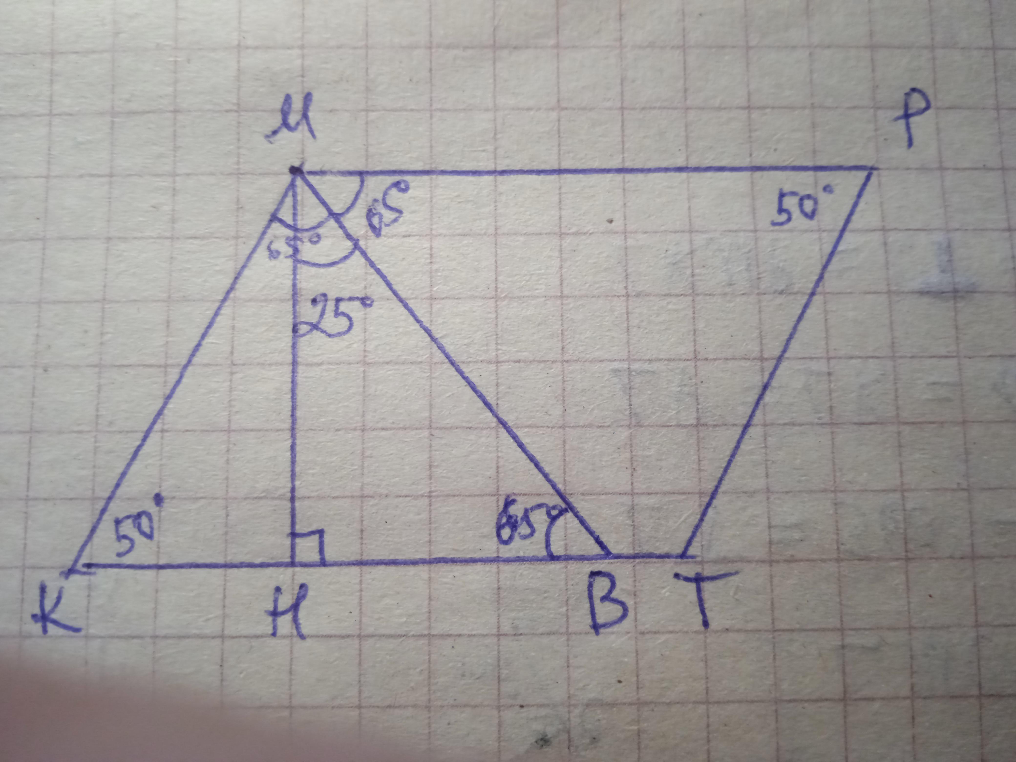 ∠ВМР=∠МВН=65° как внутренние накрест лежащие при МР║КТ и секущей МВ