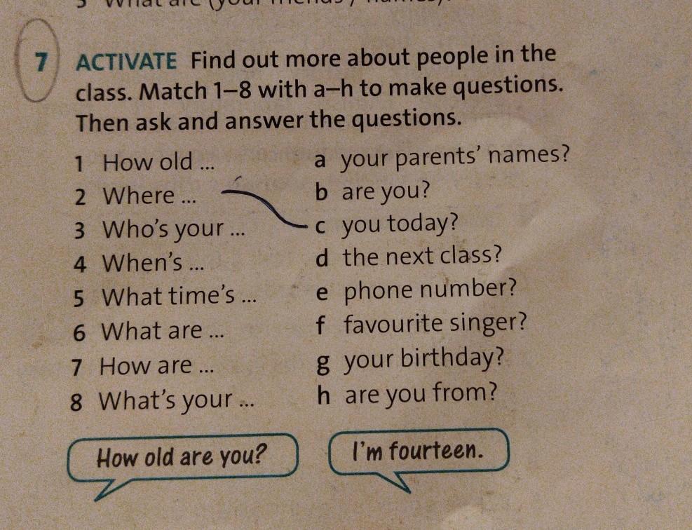 Срочнаа✨пжж✨7 класс англACTIVATE Find out more about people in the class. Match 1-8 with a-h to make questions. Then ask and answer the questions.