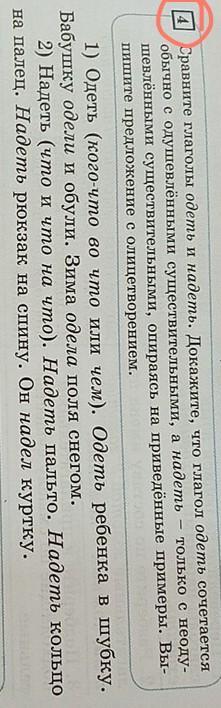 Помогите пожалуйста очень надо упражнение 4 русский язык шестой класс Сравните глаголы одеть и надеть Докажите что глагол одеть сочетается обычно с одушевлёнными существительными а надеть только с неодушевлёнными существительными опираясь на приведенные примеры Выпишите предложения с олицетворением