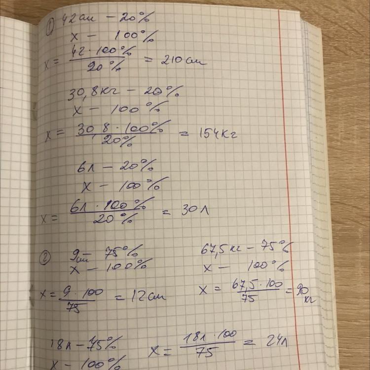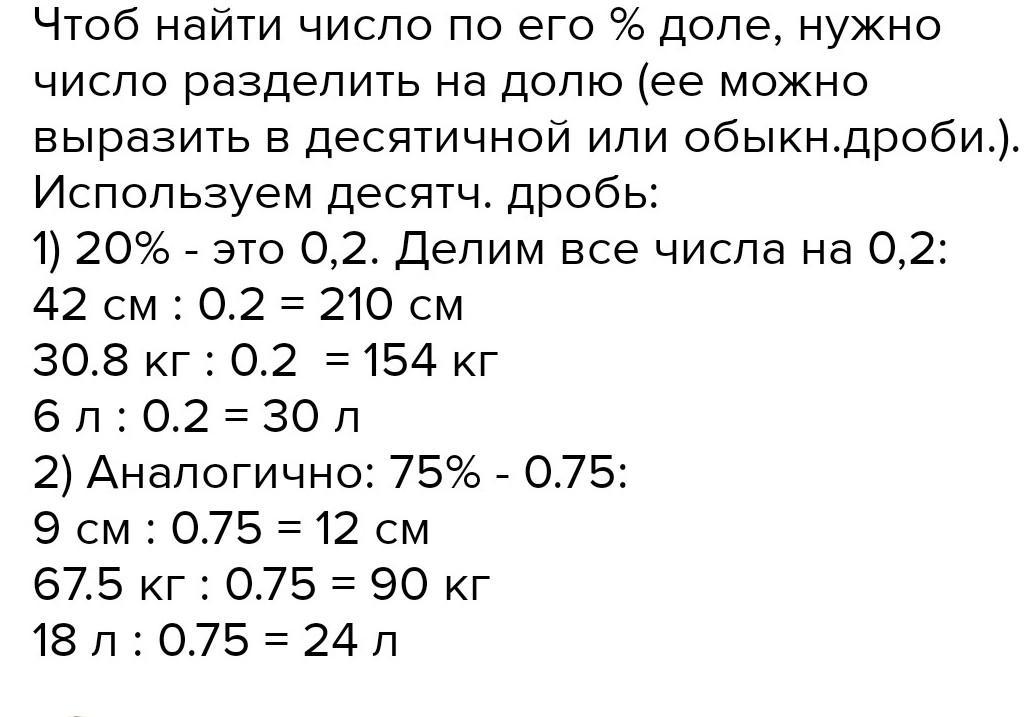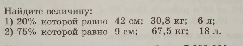 ; Найдите величину: 1) 20% которой равно 42 см; 30,8 кг; 6 л; 2) 75% которой равно 9 см; 67,5 кг; 18 л. ПОЖАЛУЙСТА РАСПИШИТЕ ВСЕ ОБЯЗАТЕЛЬНО
