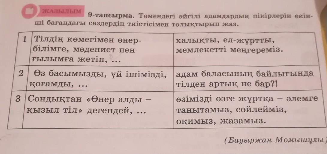 ЖАЗЫЛЫМ 9-тапсырма. Төмендегі әйгілі адамдардың пікірлерін екін- ші бағандағы сөздердің тиістісімен толықтырып жаз. . . . 1 Тілдің көмегімен өнер- халықты, ел-жұртты, білімге, мәдениет пен мемлекетті меңгереміз. ғылымға жетіп, 2 Өз басымызды, үй ішімізді, адам баласының байлығында қоғамды, тілден артық не бар?! з | Сондықтан «Өнер алды өзімізді өзге жұртқа әлемге қызыл тіл» дегендей, танытамыз, сөйлейміз, оқимыз, жазамыз. . - ... (Бауыржан Момышұлы)