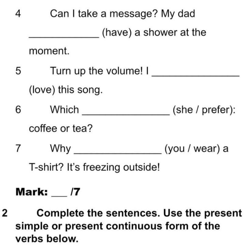 is having 2) love 3) which one does she prefer 4) why are you wearing