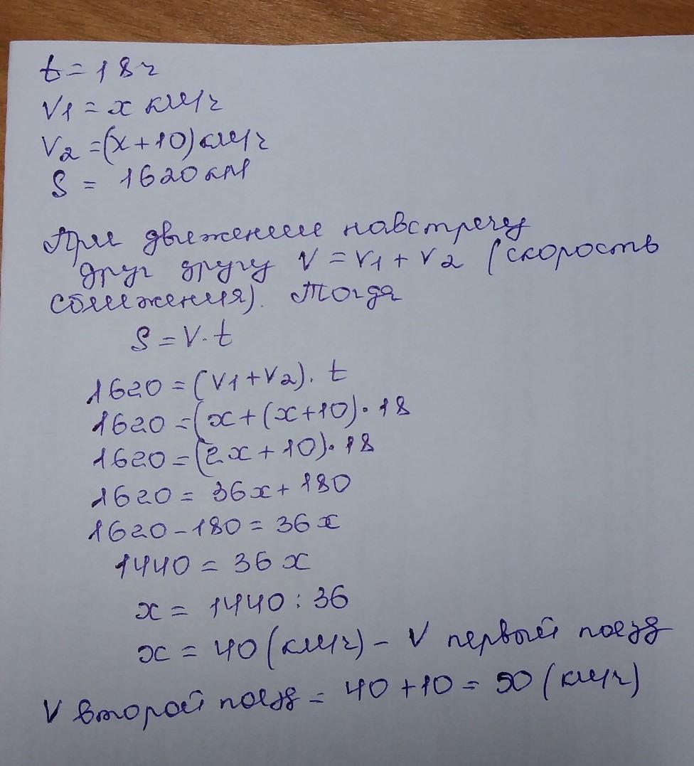 Из двух точек на встречу ехали 2 поезда. Через 18 часов они встретились. Какая у них скорость, если у второго на 10 больше, а расстояние 1620 км?