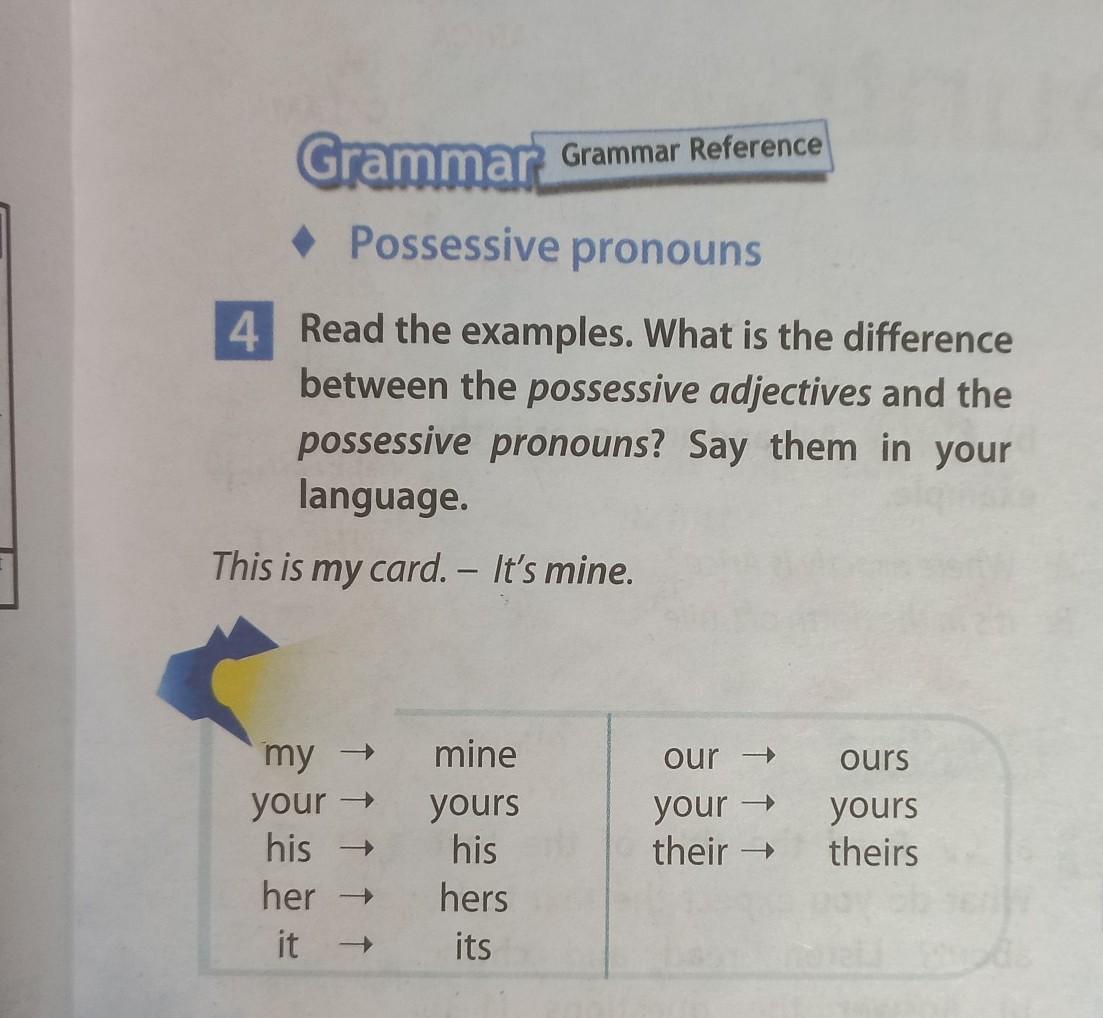 4. Read the examples. What is the difference between the possessive adjective and the possessive pronouns? Say them in your language.