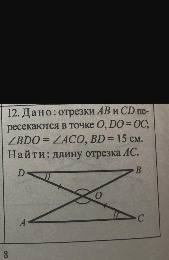 Тр-к DBO= тр-ку САО по 2 признаку равенства треугольников ( по стороне и двум прилежащим углам), значит АС=ВD=15 cм