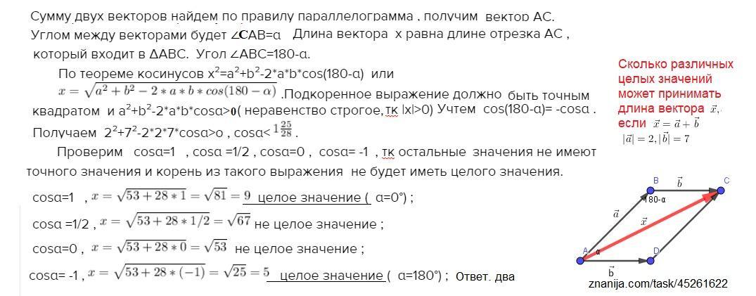 Сколько различных целых значений может принимать длина вектора x⁻, если x⁻ = a⁻ + b⁻ , |a⁻| = 2, |b⁻| = 7
