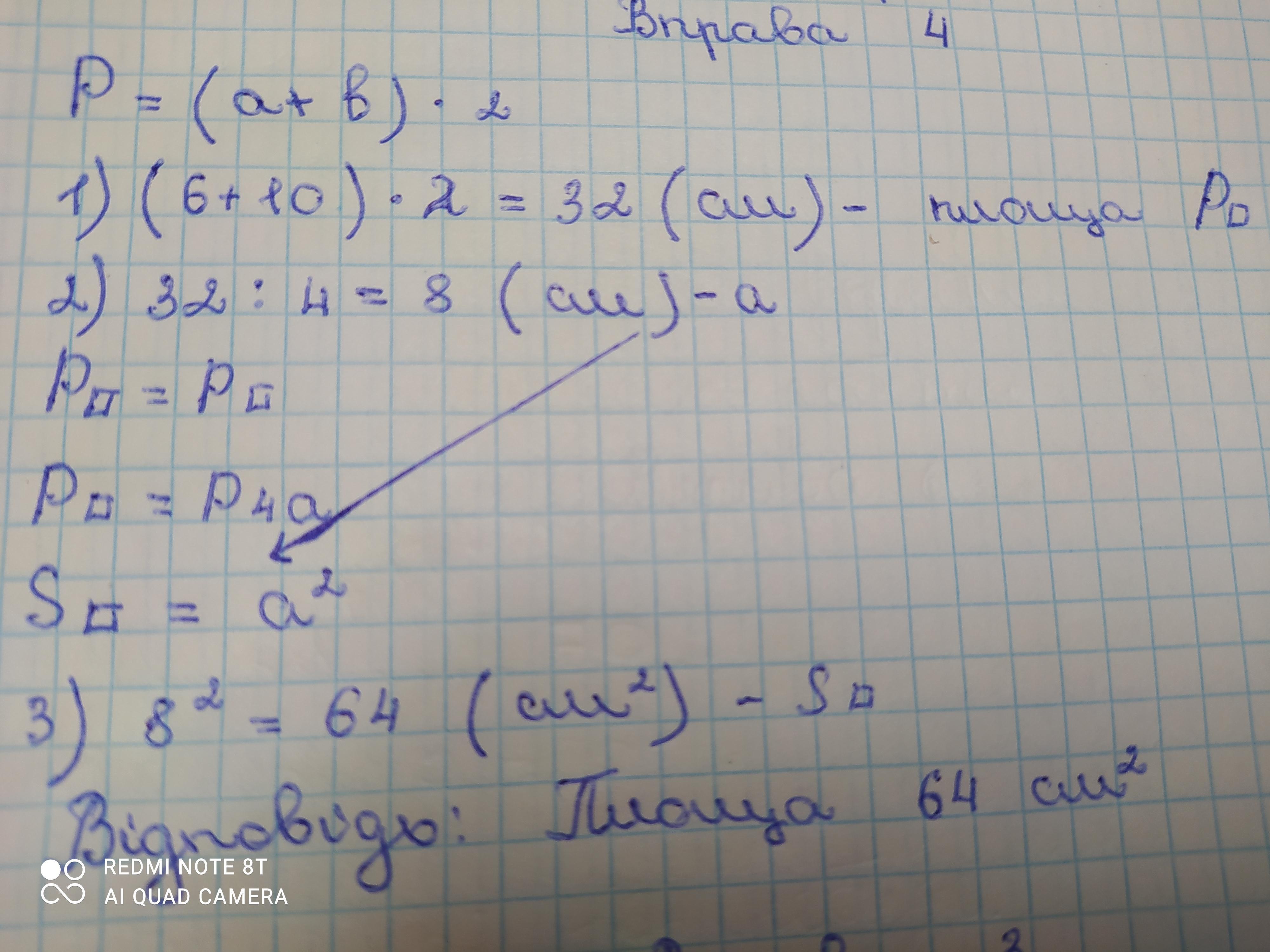 Обчисли площу квадрата, периметр якого дорівнює периметру прямокутника зі сторонами 6 см і 10 см.