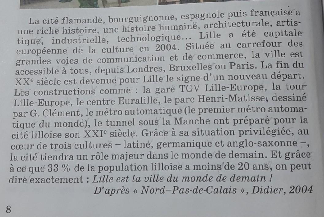 Фламандский, бургундский, испанский, а затем французский город имеет богатую историю, человеческую, архитектурную, художественную, промышленную, технологическую историю ... Лилль был культурной столицей Европы в 2004 году. Расположенный на перекрестке основных коммуникационных путей и торговли, город доступен для всех, из Лондона, Брюсселя или Парижа. Конец двадцатого века стал для Лилля знаком нового начала. Такие сооружения, как: станция скоростных поездов Лилль-Европа, башня Лилль-Европа, центр Евралиля, парк Анри-Матисса, спроектированный Ж. Клеманом, автоматическое метро (первое автоматическое метро в мире), туннель под Ла Манш подготовили для города Лилль 21 век. Благодаря своему привилегированному расположению, в сердце трех культур - латинской, германской и англосаксонской - город будет играть важную роль в мире завтрашнего дня. А благодаря тому, что 33% населения Лилля моложе 20 лет, мы можем точно сказать: Лилль - город мира завтрашнего дня! Согласно «Нор-Па-де-Кале», Дидье, 2004 г.