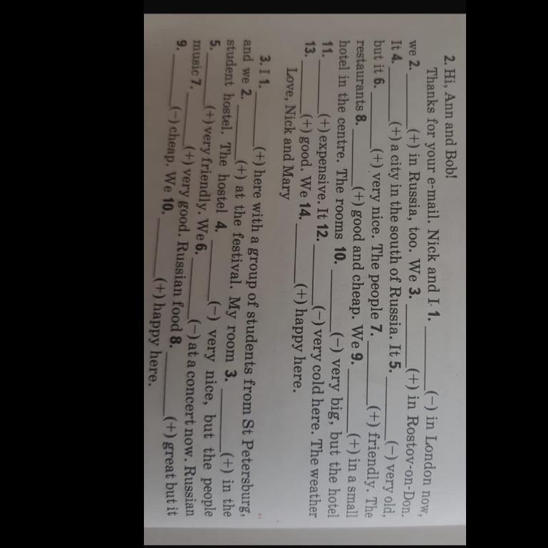 В пропуски нужно вставить глаголы to be (is/are/am). Если в скобках стоит "+", то предложение утвердительное . Например, I ___(+) here with a group of students...