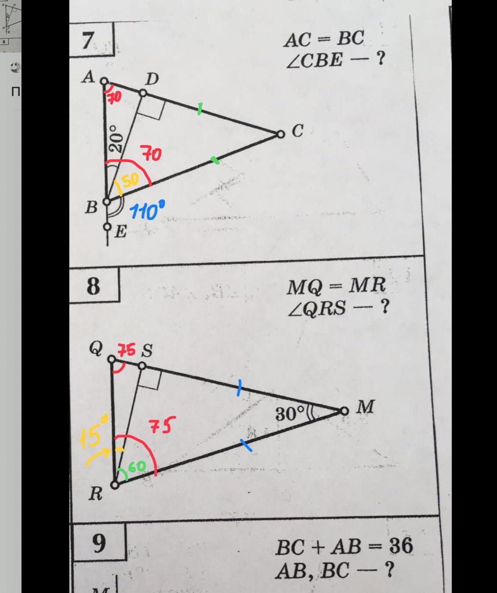 8)поскольку это равнобедренный тругольник то его углы равны (180-30)÷2=150÷2=75° (при основе)