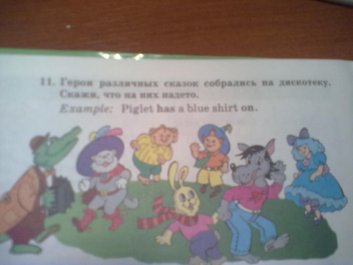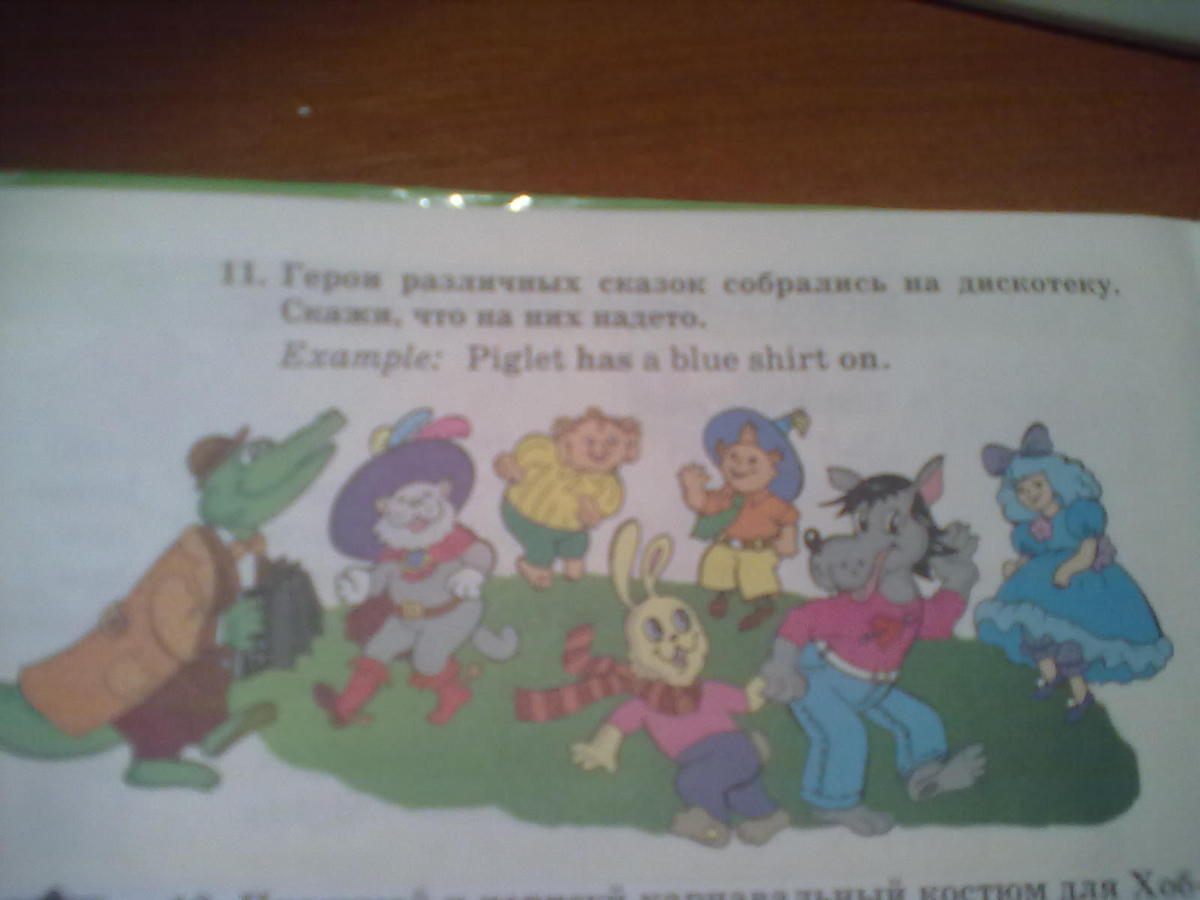 герои различных сказок собрались на дискотеку. скажи, что на них надето. example: Piglet has a blue shirt on.