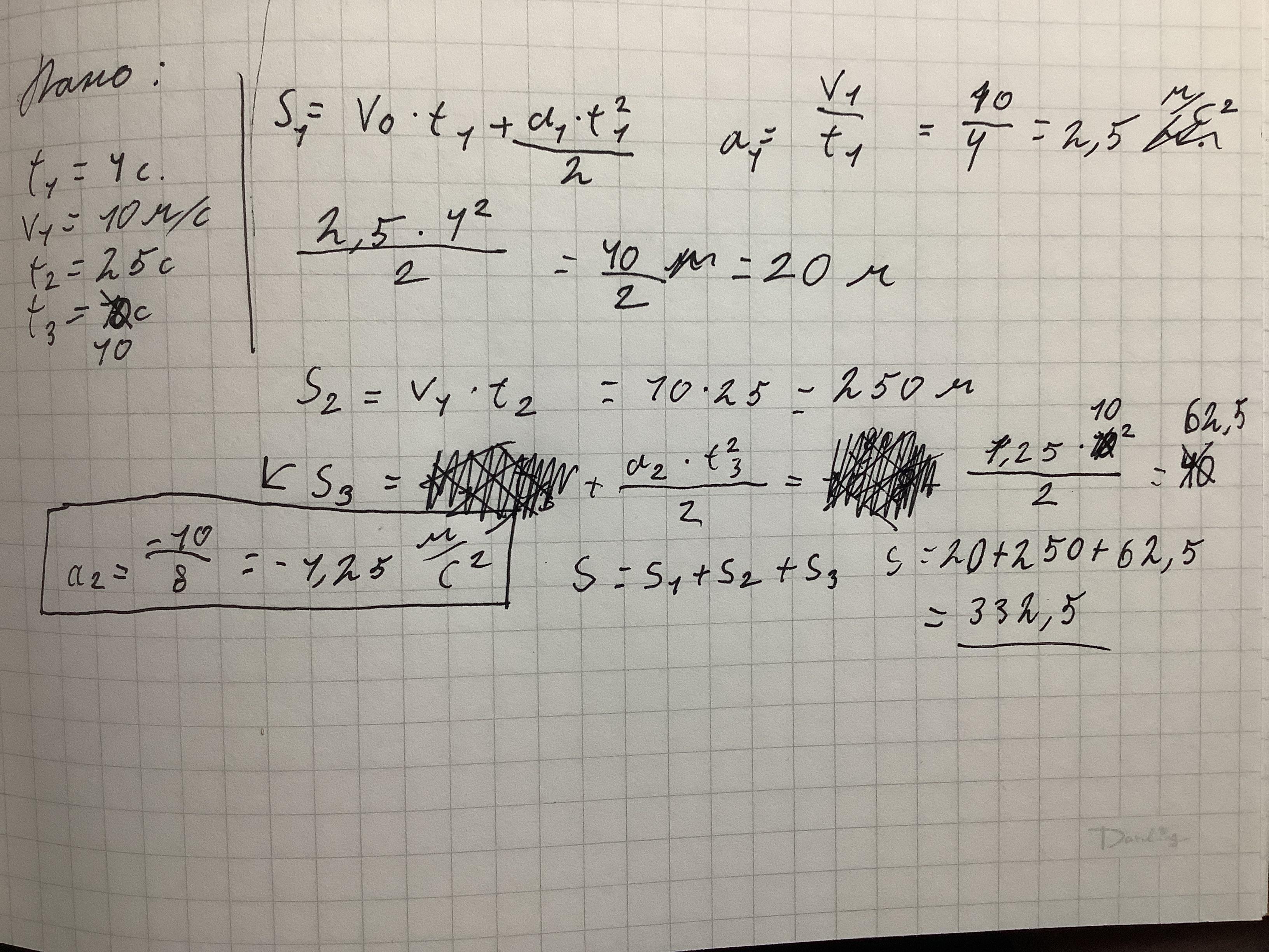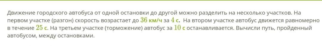 Движение городского автобуса от одной остановки до другой можно разделить на несколько участков. На первом участке (разгон) скорость возрастает до 36 км/ч за 4 с. На втором участке автобус движется равномерно в течение 25 с. На третьем участке (торможение) автобус за 10 с останавливается. Вычисли путь, пройденный автобусом, между остановками. Ответ: м.