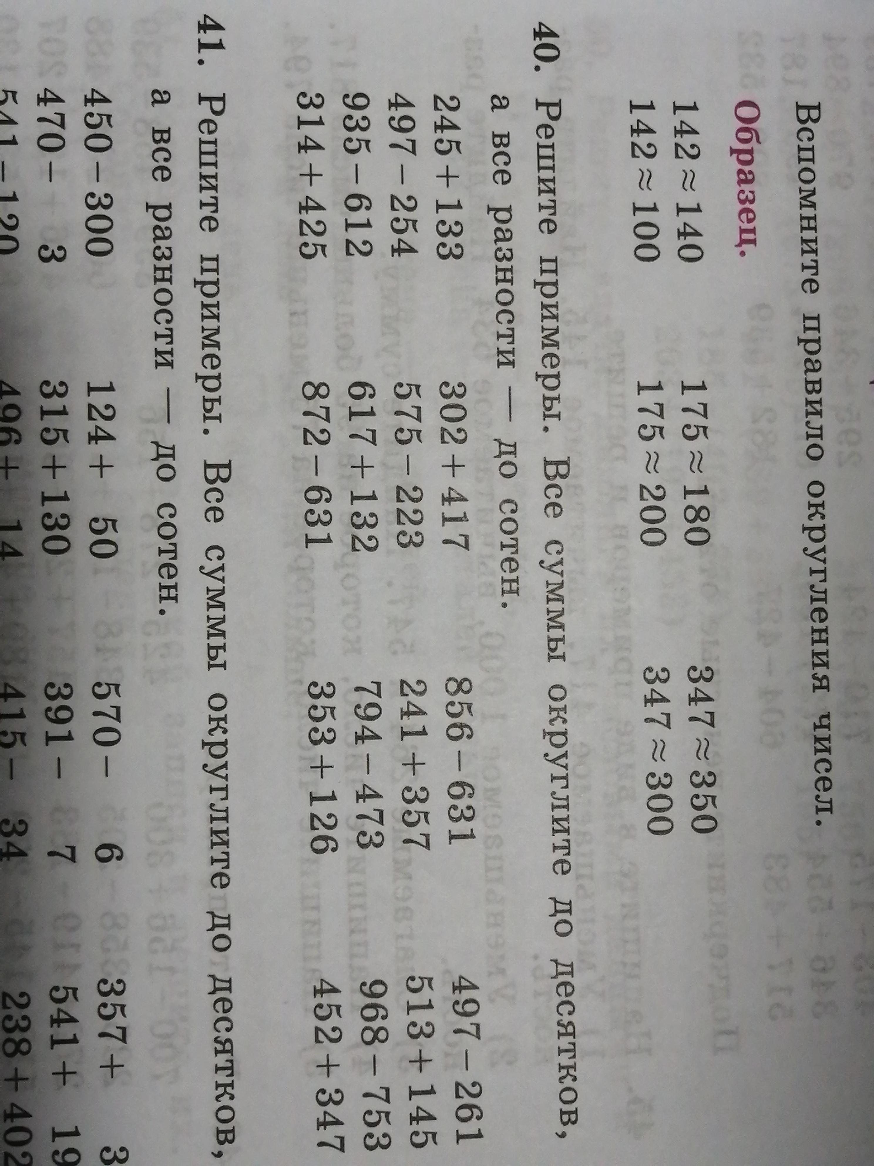 На фото Задание номер 40. Нужно суммы округлить до десятков, а разность до сотен. Помогите пару примеров сделать а я в остальное въеду. Мне бы ребёнку объяснить и самой понять. Заранее огромное спасибо.!!!
