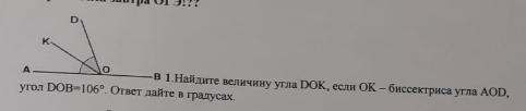 Найдите велечину угла DOK, если OK - бесектриса угла AOD. угол DOB=106 градусов. Ответ дайте в градусах