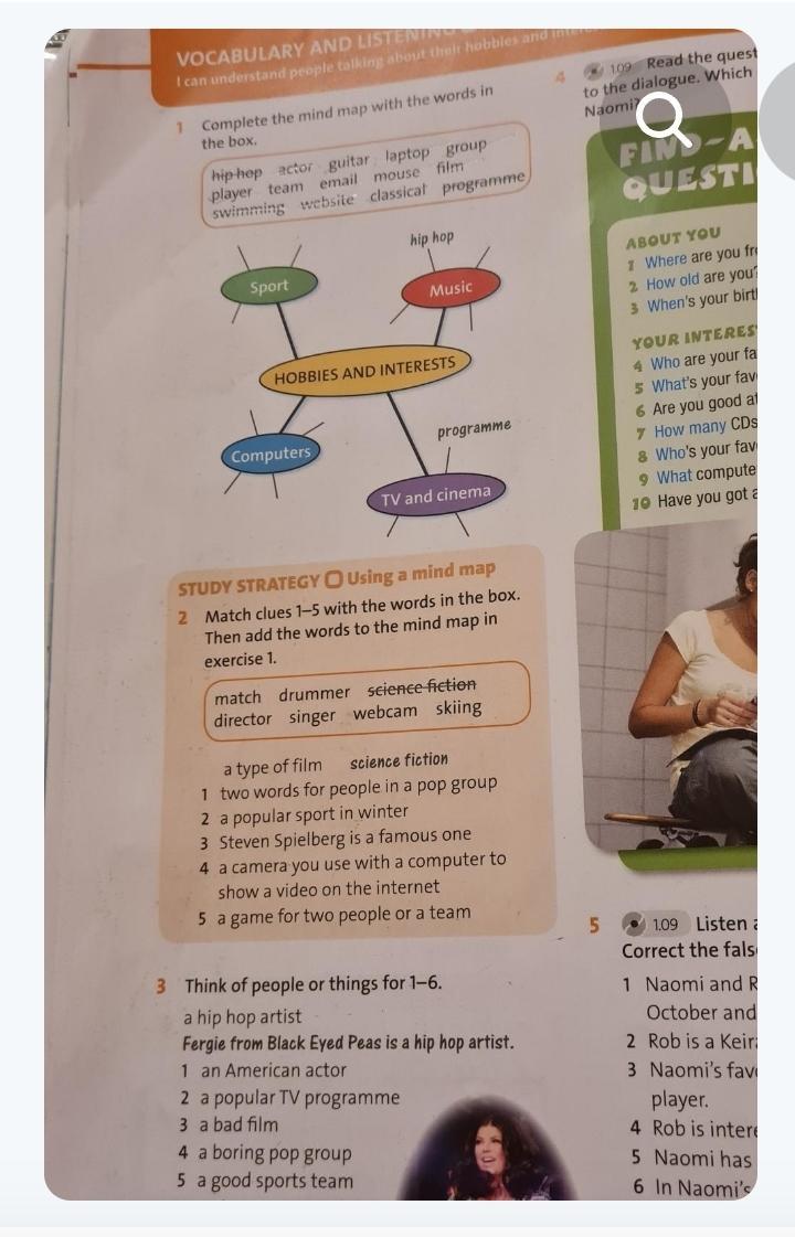 STUDY STRATEGY O Using a mind map 2 Match clues 1-5 with the words in the box. Then add the words to the mind map in exercise 1. match drummer science fiction director singer webcam skiing a type of film science fiction 1 two words for people in a pop group 2 a popular sport in winter 3 Steven Spielberg is a famous one 4 a camera you use with a computer to show a video on the internet 5 a game for two people or a team