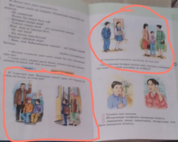 Бұл жерде балалардың ісі дұрыс емес.Олардың орнында мен болсам атаға орын берер едім, әжейге жол беріп автобусқа оны бірінші кіргізер едім, сосын кітап ұстап келе жатқан қызға көтерісіп көмектесер едім және(мына жерде дұрыс көрінбей тұр) үлкендер сөйлесіп жатқанда кедергі келтіріп сөзін бөлуге болмайды.