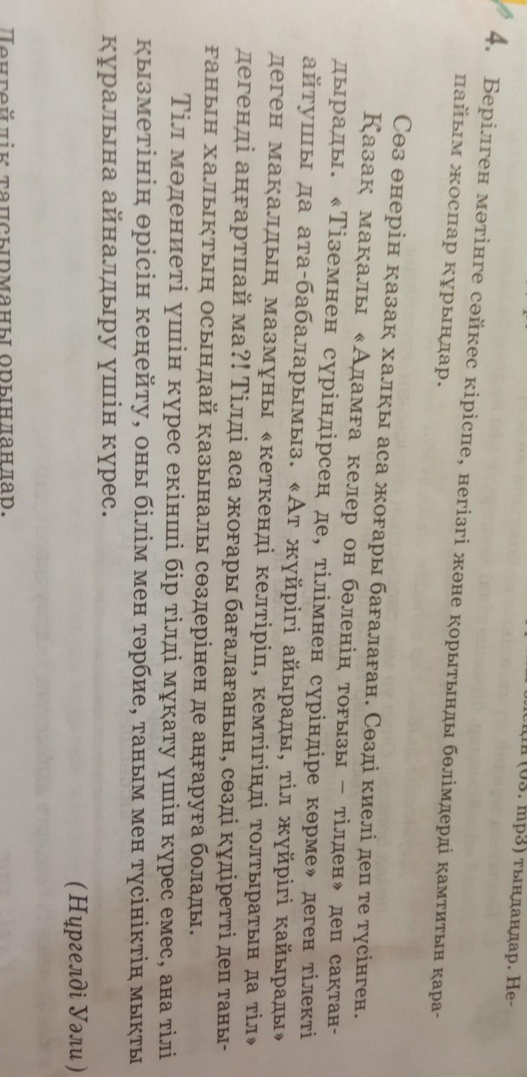 берілген мәтінге сәйкес кіріспе ,негізгі және қорытынды бөлімдерді қамтитын қарапайым жоспар құрындар