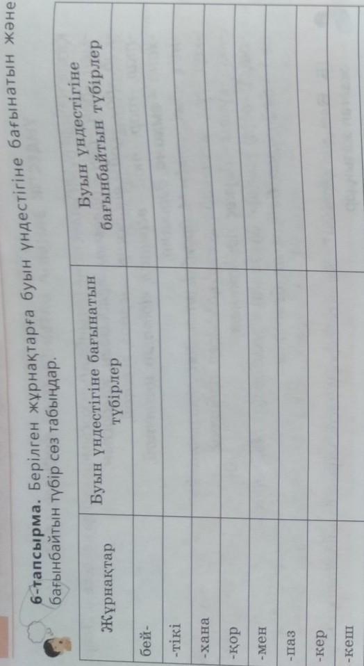 6-тапсырма. Берілген жұрнақтарға буын үндестігіне бағынатын және бағынбайтын түбір сөз табыңдар. Жұрнақтар Буын үндестігіне бағынатын түбірлер Буын үндестігіне бағынбайтын түбірлер бей- -тікі -хана -қор - Мен -Да3 -кер -кеш -тал