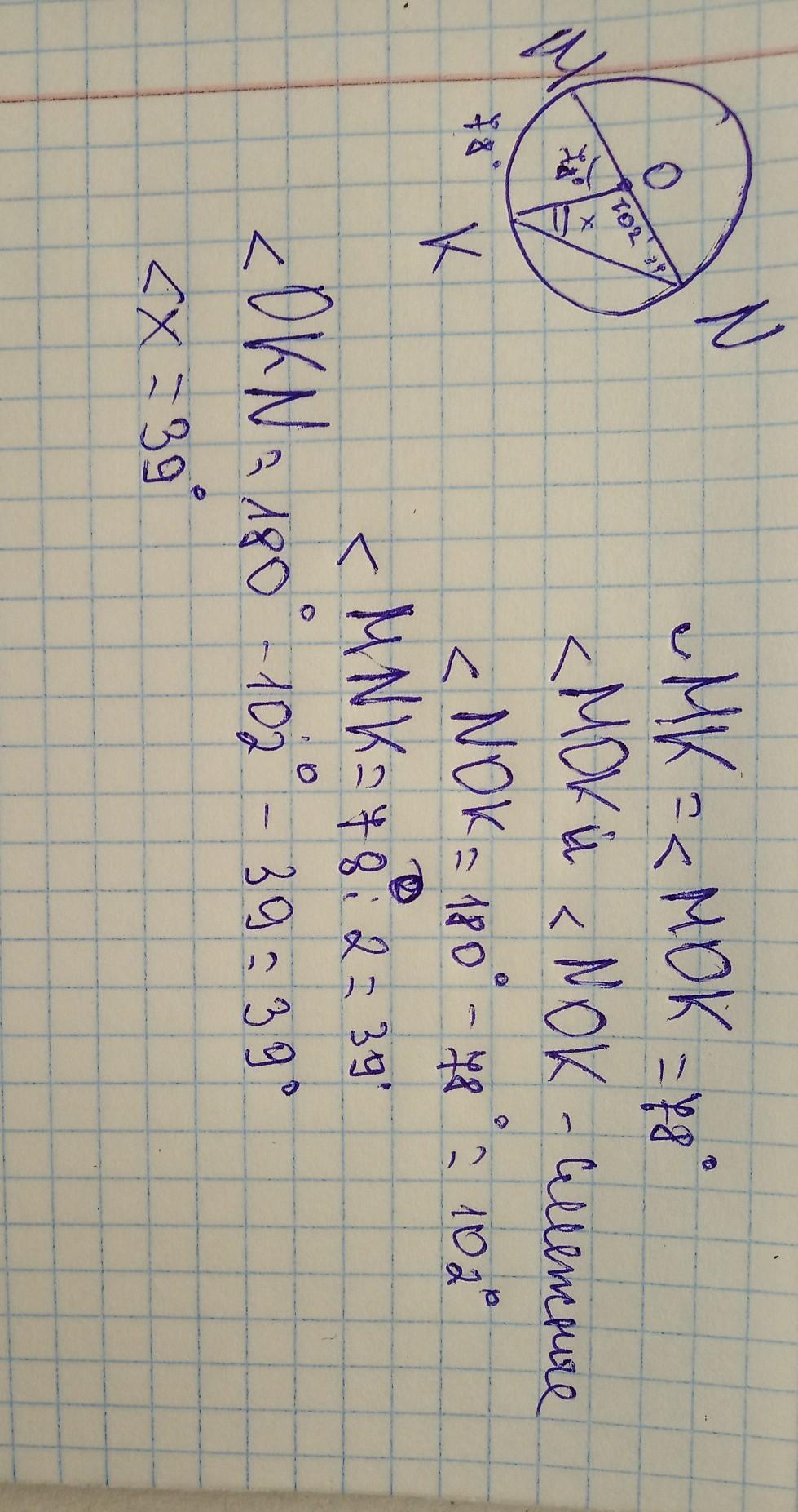 по теоремам треугольник равнобедрены тогда 180-78=102° <НОК