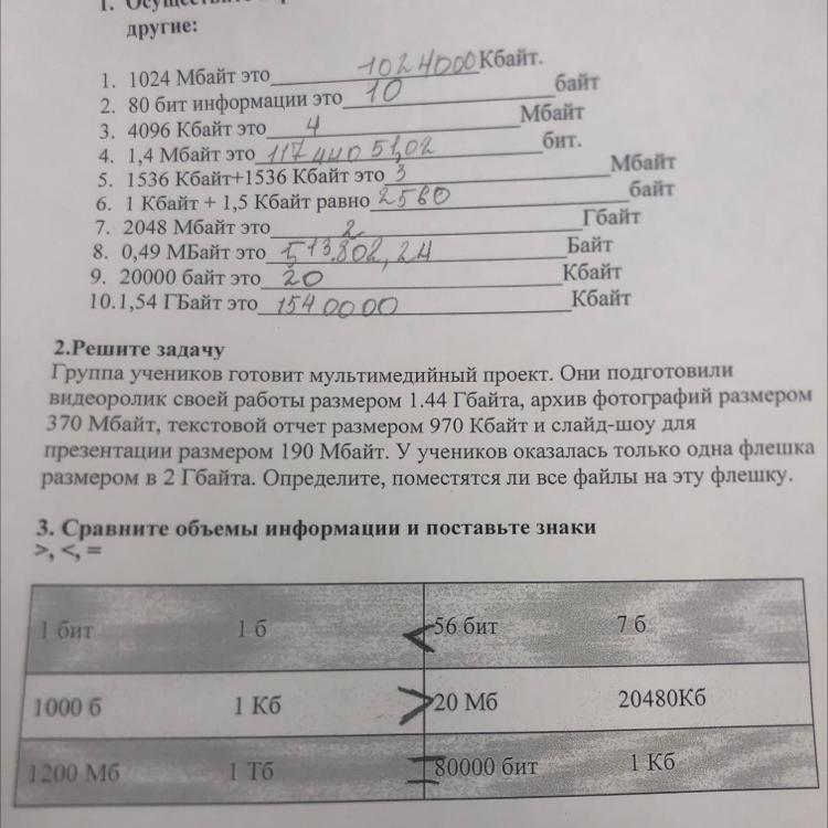Группа учеников готовит мультимедийный проект. Они подготовили видеоролик своей работы размером 1.44 Гбайта, архив фотографий размером 370 Мбайт, текстовой отчет размером 970 Кбайт и слайд-шоу для презентации размером 190 Мбайт. У учеников оказалась только одна флешка размером в 2 Гбайта. Определите, поместятся ли все файлы на эту флешку.