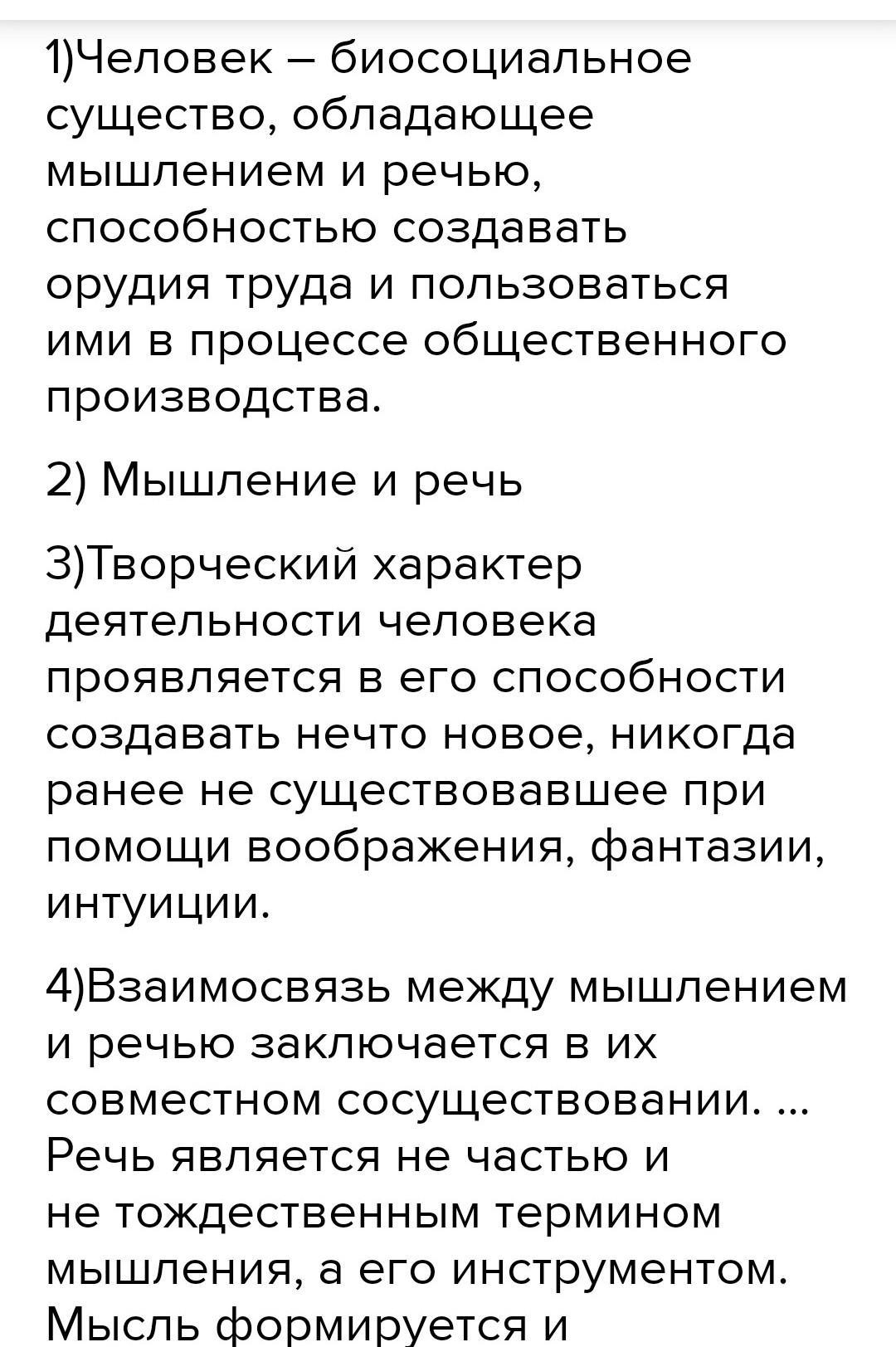 1. Что означают слова: «Человек существо биосоциальное»? 2. Какие качества человека имеют социальную природу (т. е. возни- кают только в обществе)? 3. В чём проявляется творческий характер деятельности человека? 4. В чём состоит взаимосвязь между мыш- лением и речью? 5. Как проявляются способности человека? 6. Что такое самореализация человека? 7. Почему самореализация человека возможна только в деятельности?