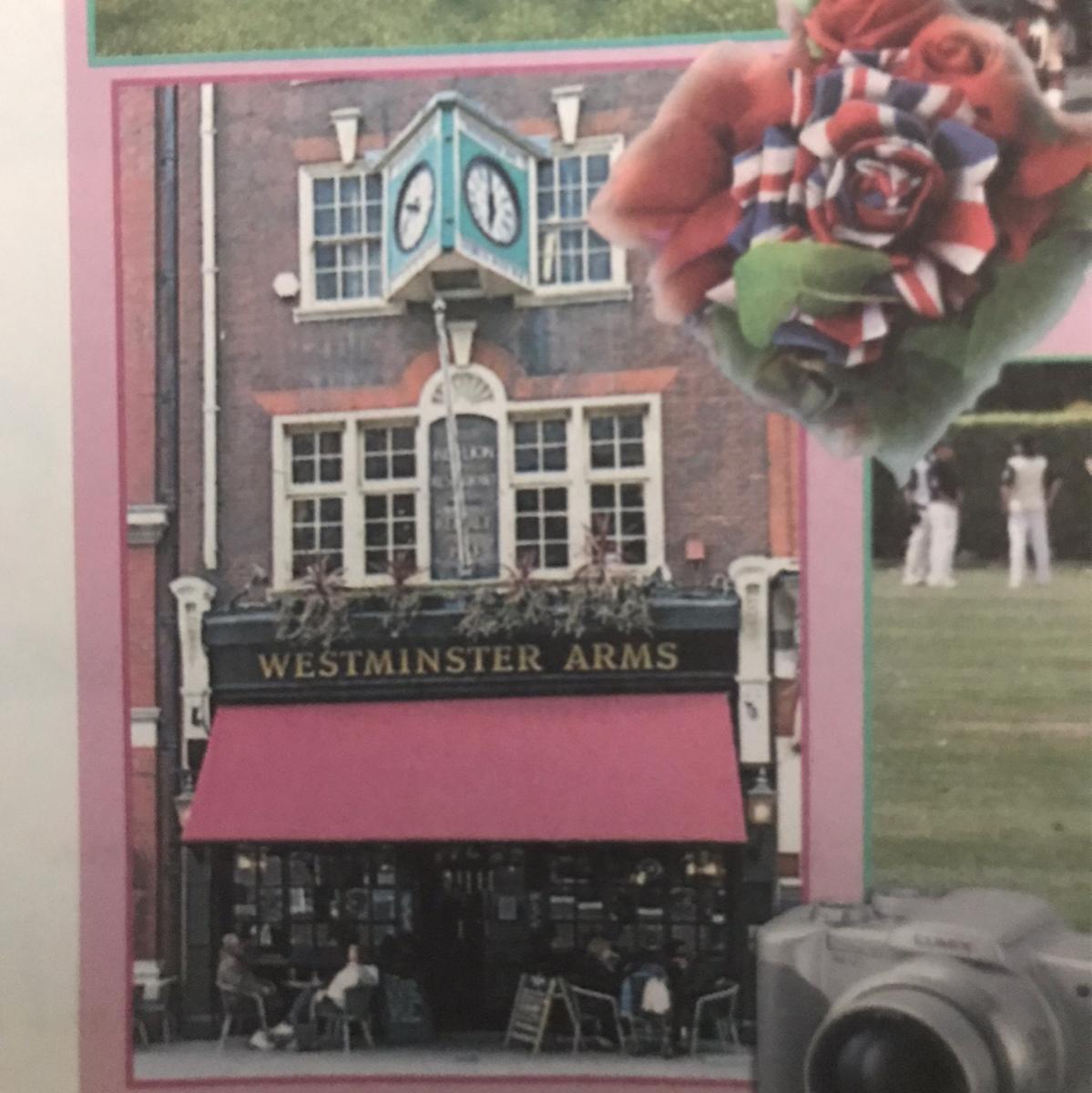 in the picture there is a picture of a photo camera ahd flowers of a book ,people are sitting on chairs in a cafe