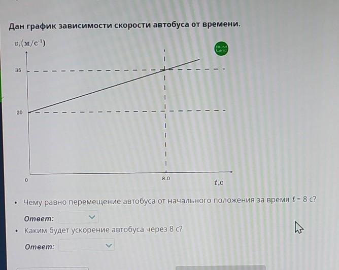 Чему равно перемещение автобуса от начального положения за время t=8с ?