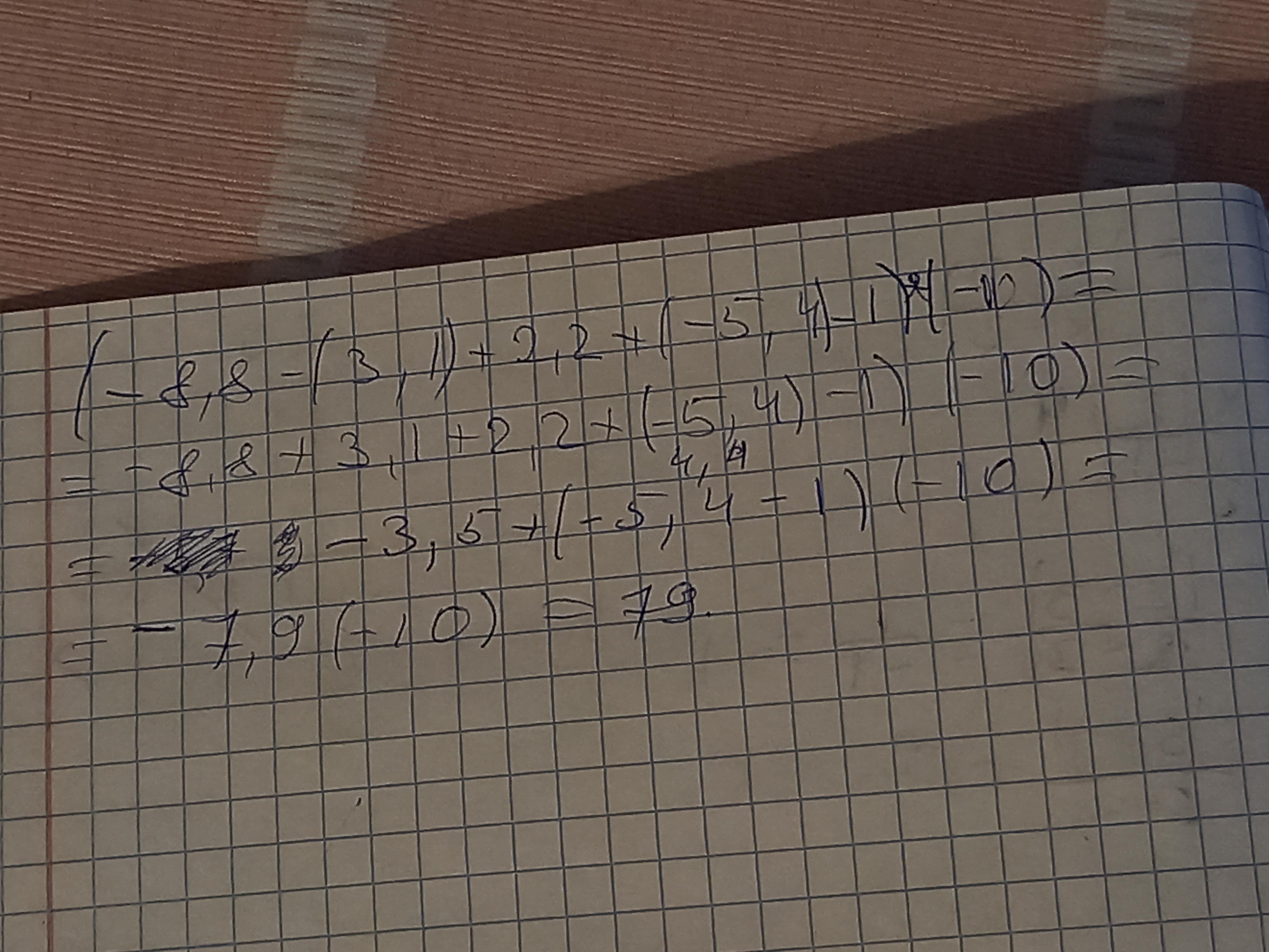 Объяснение:(-8,8-(-3,1)+2,2+(-5,4)-1)*(-10)=-8,8+3,1+2,2+(-5,4-1)*(-10)=-3,5+(-4,4)*(-10)=-7,9×(-10)=79 так как минус на минус плюс