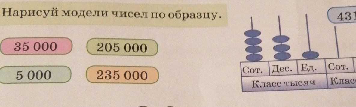 7. Нарисуй модели чисел по образцу. 431 000 a) 35 000 1 8 205 000 б) 5 000 235 000 Сот. Дес. | Ед. Сот. Дес. | Ед. Класс тысяч Класс единиц