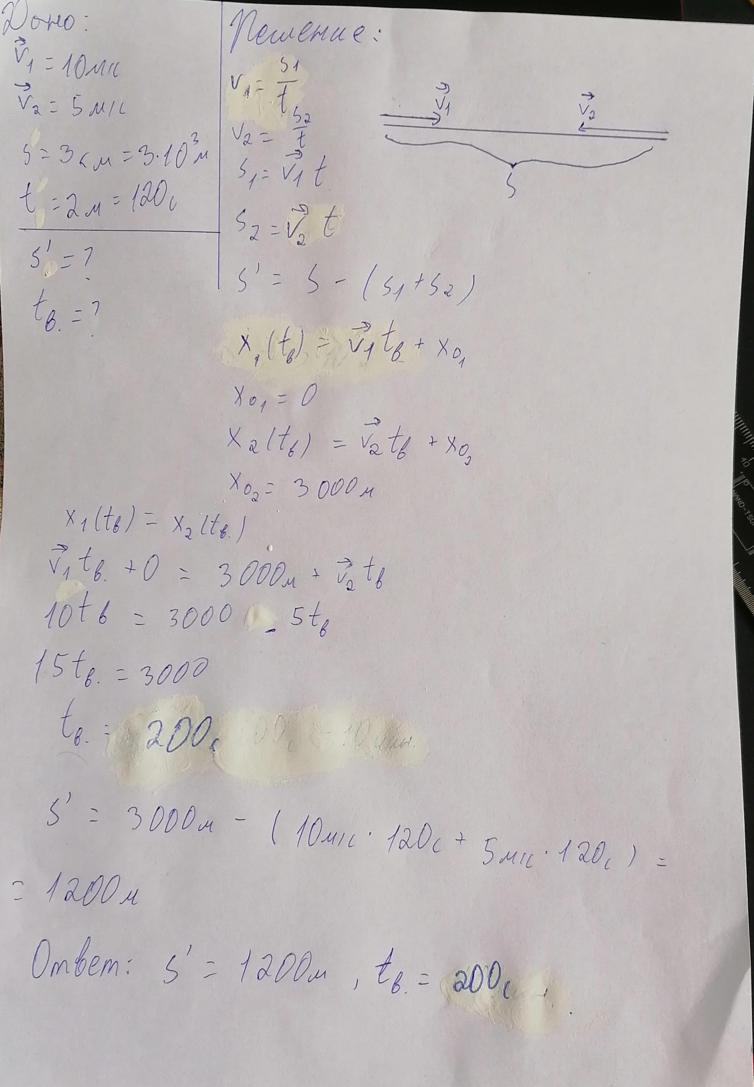 два велосипедиста двигаются навстречу друг другу со скоростями 10м\с и 5м\с начальное расстояние между ними 3км. Определить расстояние между велосипедистами через 2 минуты и через сколько времени они встретятся.