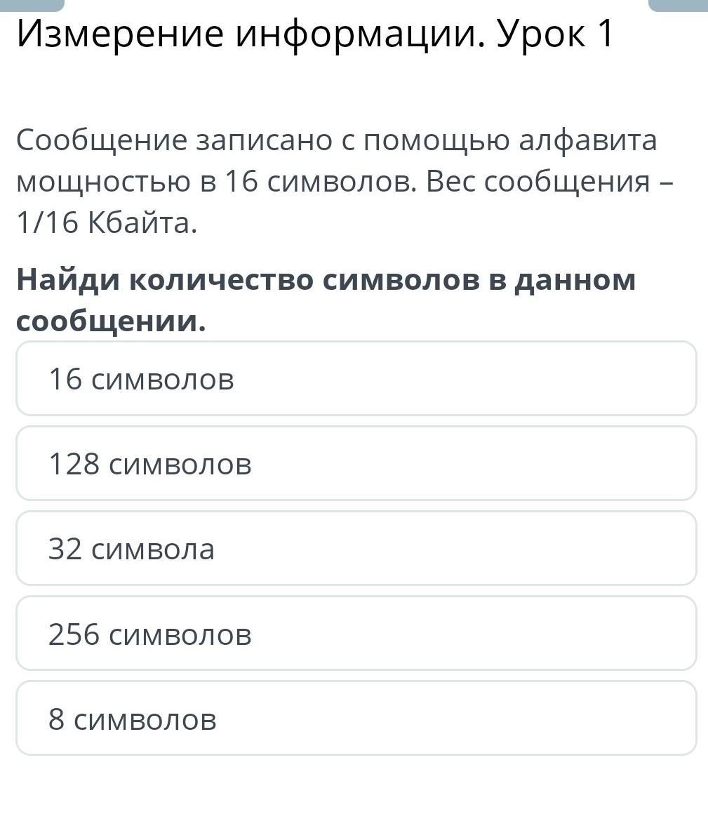 l=1/16 Кбайт=16 байт = 512 бит