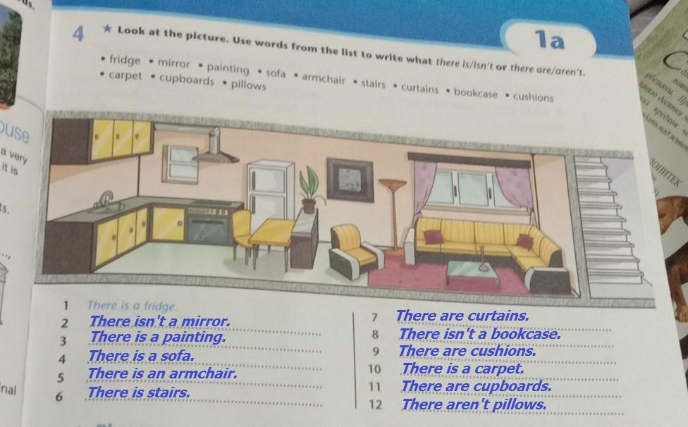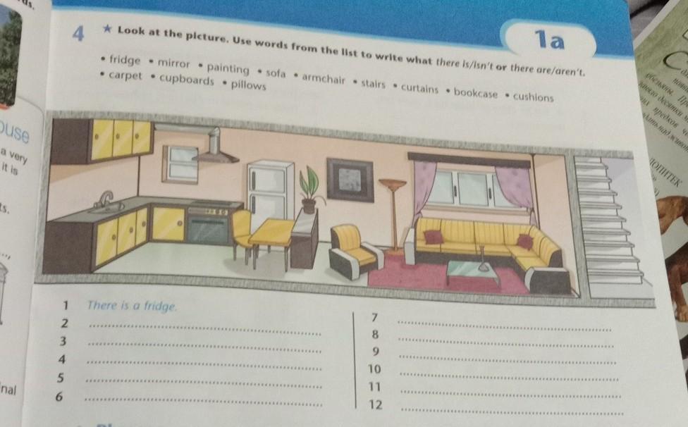 1а 4 * Look at the picture. Use words from the list to write what there is/isn't or there are/aren't. • fridge mirror painting sofa • armchair stairs . curtains bookcase cushions • carpet cupboards • pillows 1 There is a fridge 7 2. 8 3 9 4 .. 10 11 5 6 12 Phrases срочно на все 12 вопросов пожалуйста