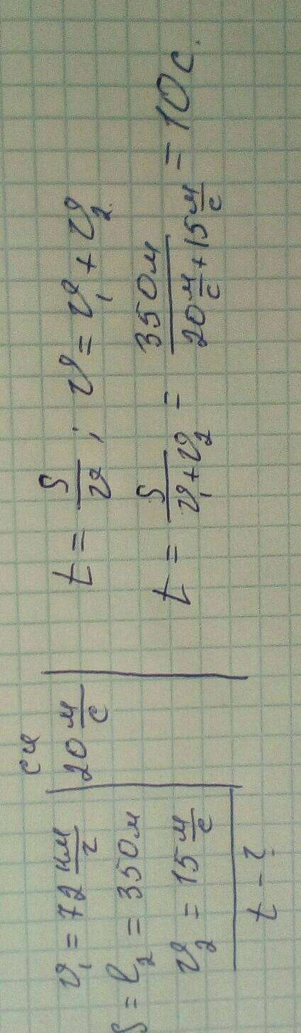 пассажир поезда, движущегося со скоростью 72 км/ч наблюдает из окна за движением встречного поезда длиной 350м, идущие на скорости 15 метров секунду.