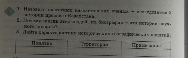 1. Назовите известных казахстанских ученых исследователей истории древнего Казахстана. 2. Почему жизнь этих людей, их биография это история науч- ного подвига? 3. Дайте характеристику исторических географических понятий: Понятие Территория Примечания.
