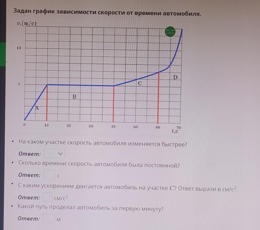 3. На участке С ускорение автомобиля равно (7 - 3)/(60 - 40) = 4/20 = 1/5 = 0,2 (м/с²) = 20 (см/с²).